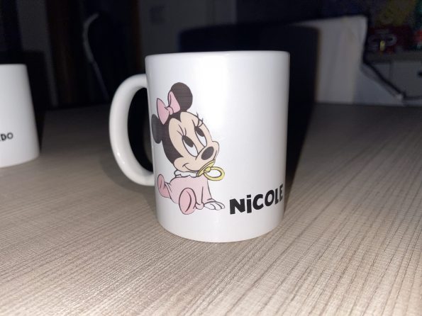 Mug personalizzato in ceramica con nome in vinile e adesivo trasparente.