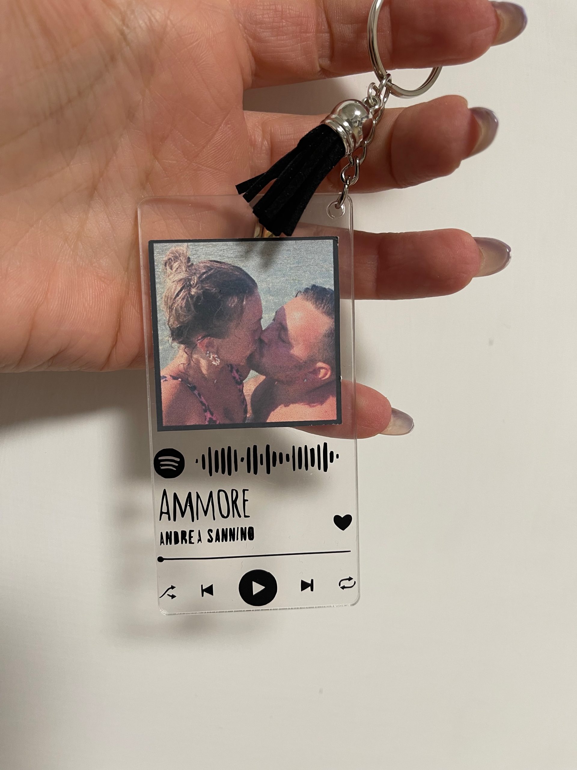 Portachiavi con traccia spotify in vinyle, fotografia in adesivo.
