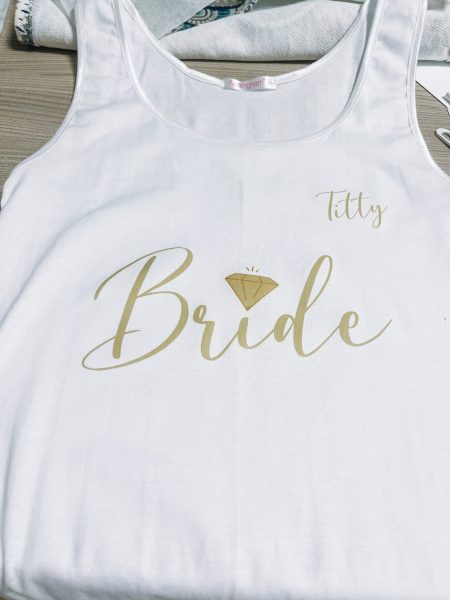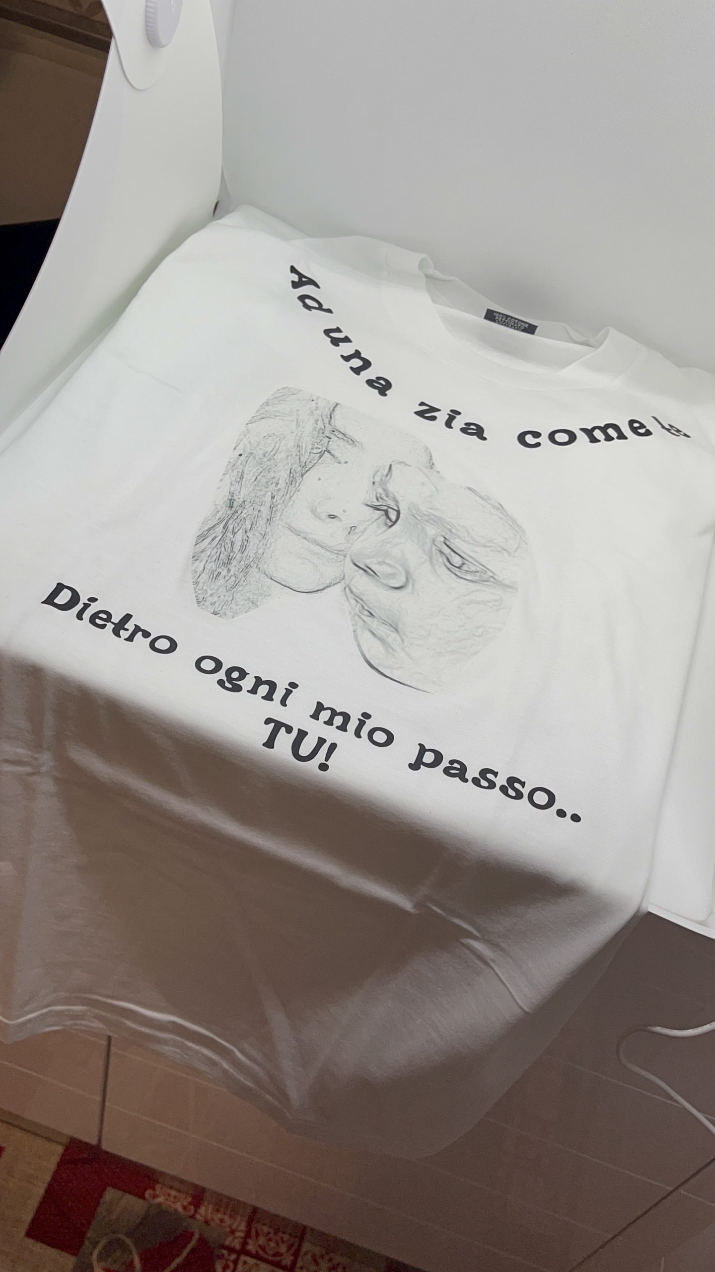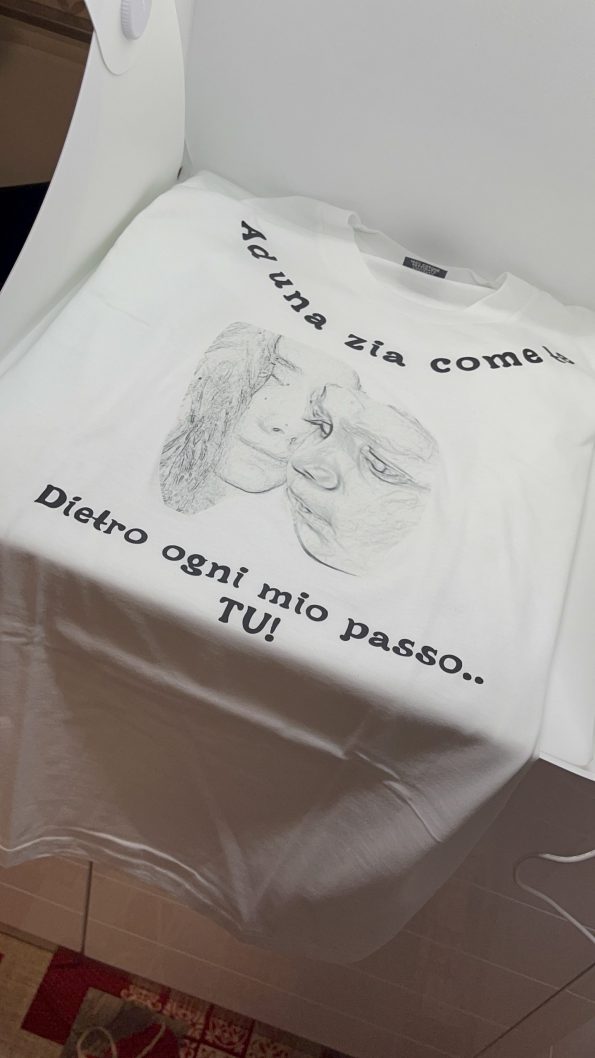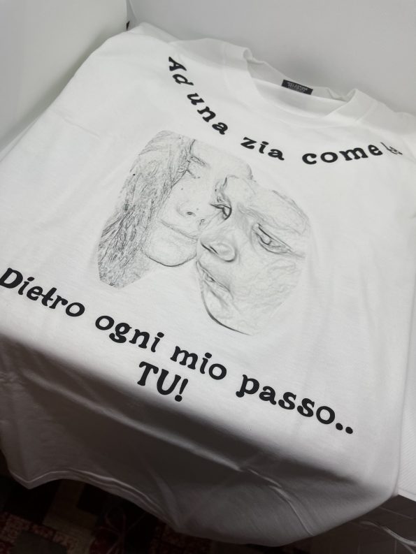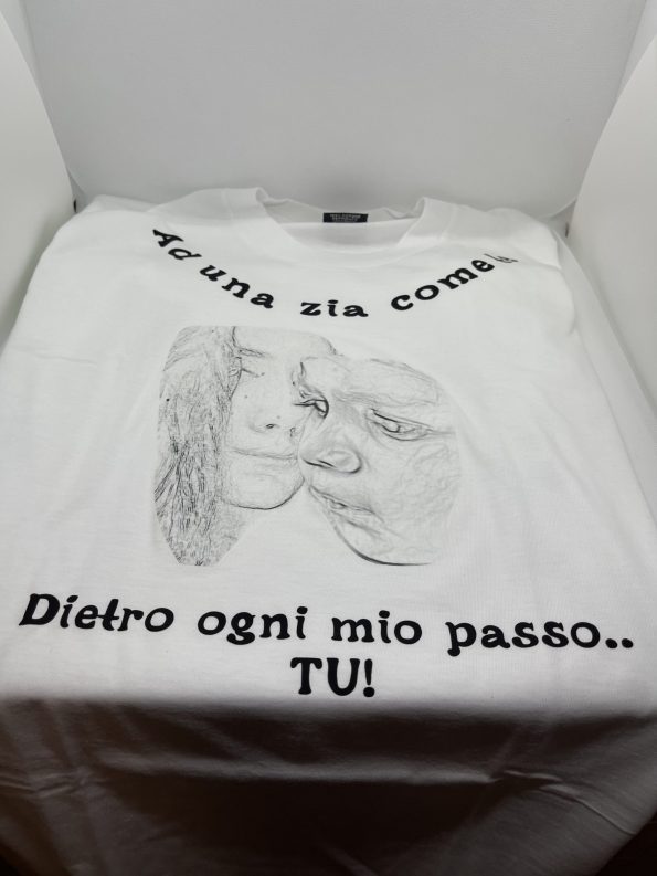 T shirt personalizzata in cotone con stampa e scritta con trasferimento inchiostro infusibile.