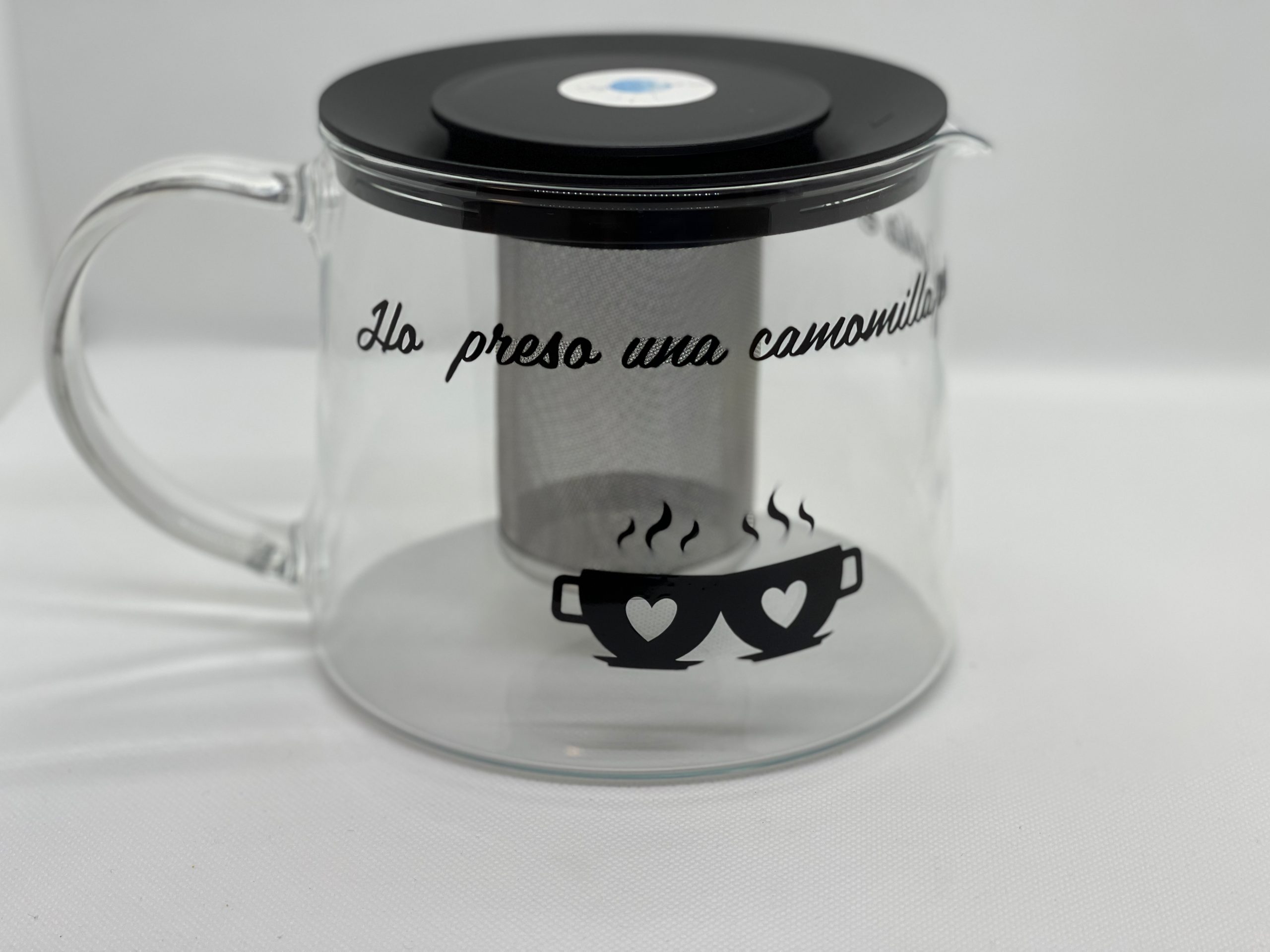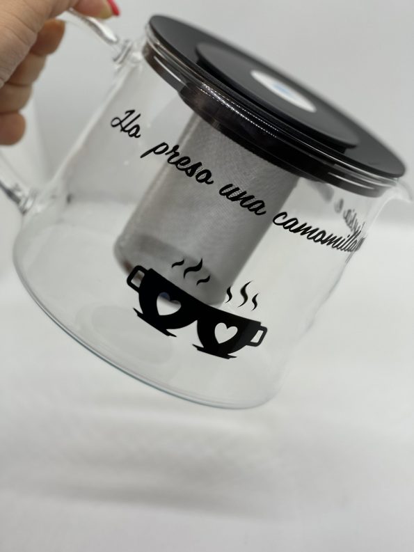 Tisaniera in vetro con stampa in vinile, disponibile sono in nero.